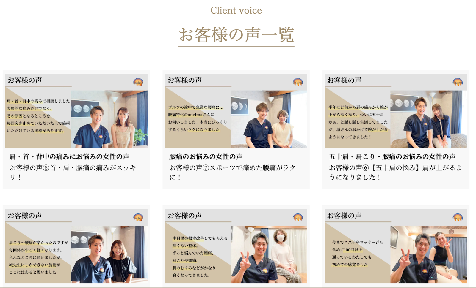 慢性的な腰痛・肩こり・頭痛にお悩みだった方からは、「城さんの技術も知識も素晴らしいですし、話しやすく柔らかい人柄で安心して通い続けられるサロンです」というお声をいただきました。当院では身体の状態を丁寧に説明しながら全身を診る施術を行うため、「痛くないのでリラックスして受けられる」「毎回たくさんの気づきがある」と皆様に喜ばれています。